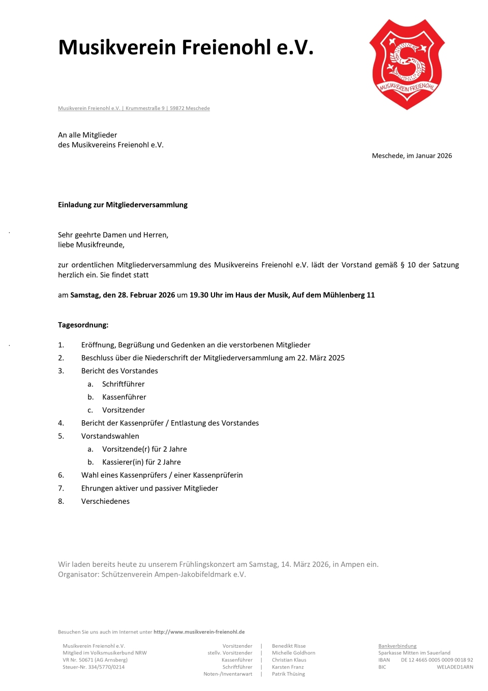 Der Vorstand des Musikvereins lädt alle Mitglieder für Samstag, 28. Februar 2026 um 19.30 Uhr zur jährlichen Mitgliederversammlung ein. Die Mitgliederversammlung findet im Haus der Musik, Auf dem Mühlenberg 11 in Meschede-Freienohl statt.