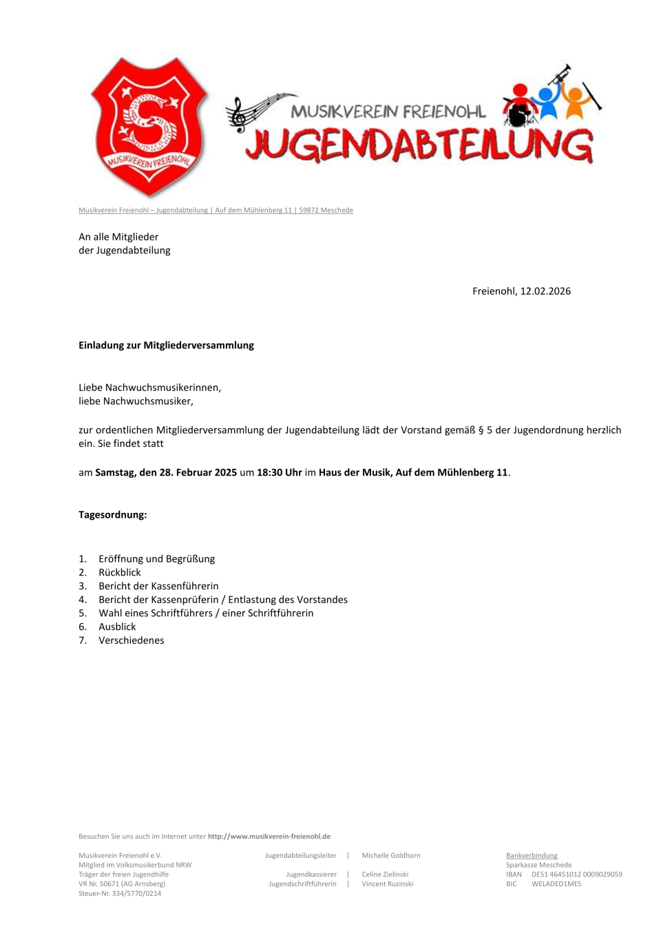 Der Vorstand des Musikvereins lädt alle Mitglieder für Samstag, 28. Februar 2026 um 19.30 Uhr zur jährlichen Mitgliederversammlung ein. Die Mitgliederversammlung findet im Haus der Musik, Auf dem Mühlenberg 11 in Meschede-Freienohl statt.